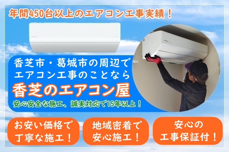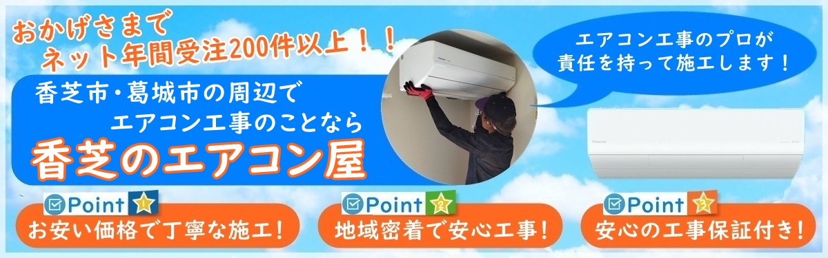 香芝のエアコン屋は家庭用のエアコン工事を主にエアコン取り付け・取り外し工事をおこなっている地域密着のエアコン工事業者で、香芝市・葛城市を中心に奈良県で活動しております。